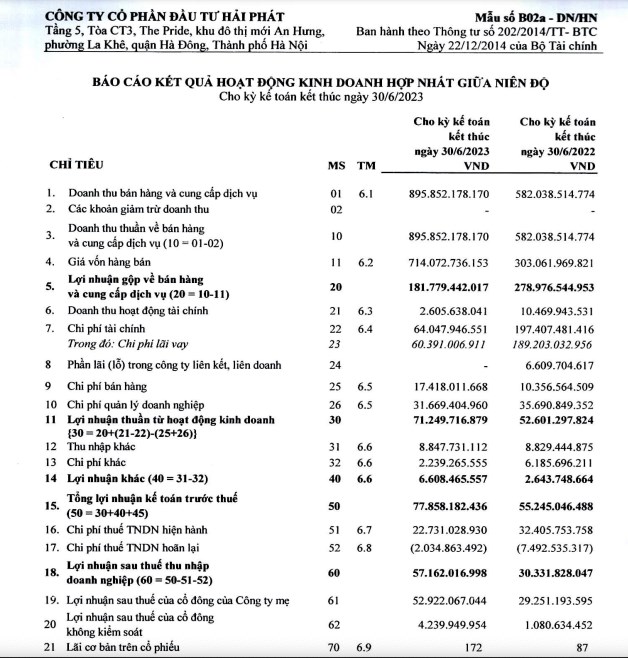 Về kết quả kinh doanh, theo báo cáo tài chính hợp nhất bán niên 2023 sau soát xét, HPX ghi nhận doanh thu thuần đạt 895,8 tỷ đồng, tăng 53% so với cùng kỳ năm ngoái.