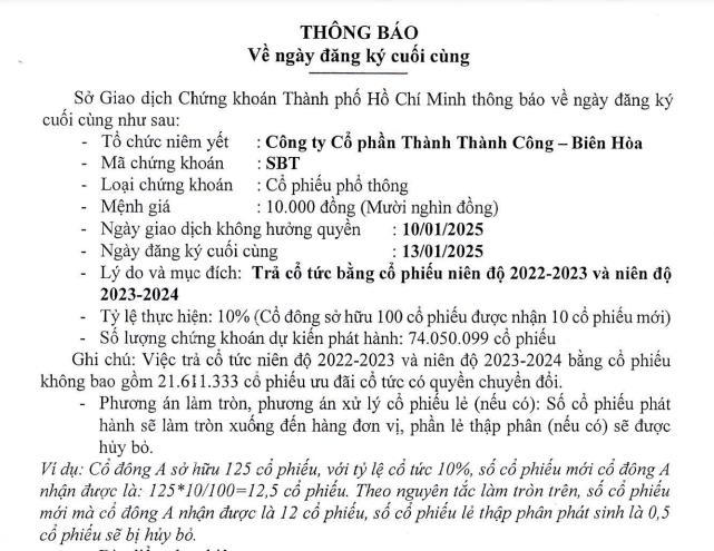 Công ty cổ phần Thành Thành Công - Biên Hoà (TTC AgriS, mã ck: SBT) vừa thông báo chốt danh sách cổ đông thực hiền quyền trả cổ tức niên độ 2022 - 2023 và niên độ 2023 - 2024. Ngày đăng ký cuối cùng là vào ngày 13/1, ngày giao dịch không hưởng quyền 10/1.
