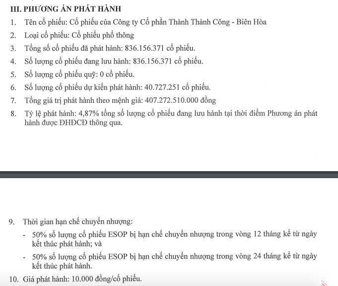 Về thời gian hạn chế chuyển nhượng cổ phiếu này, 50% số lượng cổ phiếu ESOP bị hạn chế chuyển nhượng trong vòng 12 tháng kể từ ngày kết thúc phát hành và 50% số lượng cổ phiếu ESOP bị hạn chế chuyển nhượng trong vòng 24 tháng kể từ ngày kết thúc phát hành. Thời gian nộp tiền mua cổ phiếu từ 15/09 - 12/10.