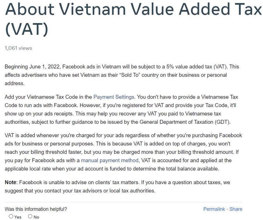 "Bắt đầu từ ngày 1 tháng 6 năm 2022, quảng cáo Facebook tại Việt Nam sẽ phải chịu thuế giá trị gia tăng (VAT) 5%. Quy định mới áp dụng cho các nhà quảng cáo đặt Việt Nam là quốc gia mục tiêu trên địa chỉ doanh nghiệp hoặc địa chỉ cá nhân của họ.