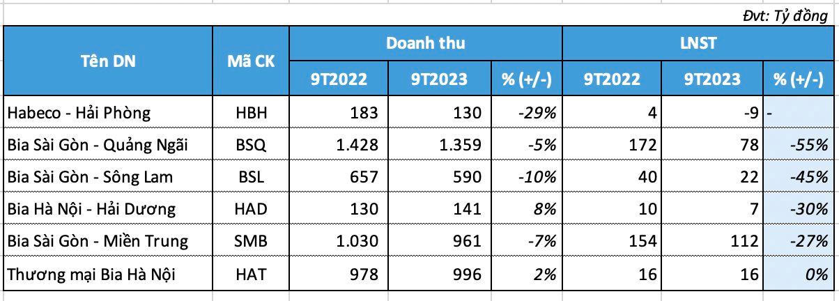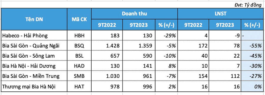 Những đơn vị còn lại cũng đồng loạt giảm lãi mạnh, đơn cử Bia Sài Gòn - Quảng Ngãi giảm đến 55% LNST sau 9 tháng (chỉ còn 78 tỷ đồng), Bia Sài Gòn - Sông Lam giảm 45% xuống còn 22 tỷ; Bia Hà Nội - Hải Dương giảm 1/3 lợi nhuận chỉ còn 7 tỷ đồng...