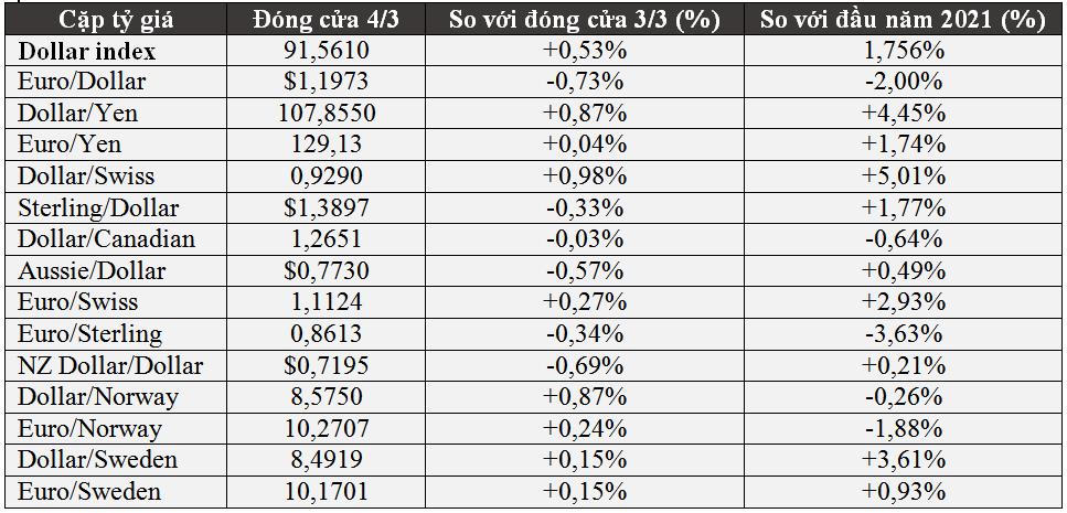 Chỉ số dollar index đã tăng 0,53% vào cuối ngày 4/3, lên mức cao nhất kể từ ngày 1/12/2020; trong khi đó đồng EUR giảm 0,73% xuống 1,1973 USD, thấp nhất kể từ ngày 5/2.