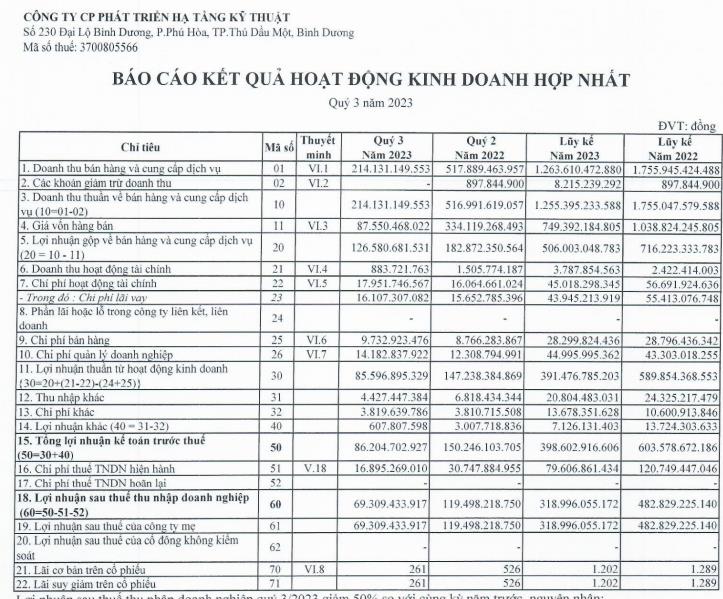 Về bức tranh tài chính, quý III/2023, Becamex IJC ghi nhận doanh thu thuần đạt 213,1 tỷ đồng, giảm 58,5% so với cùng kỳ năm ngoái.