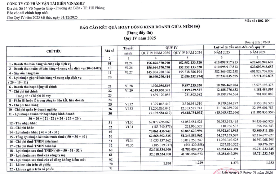CTCP Vận tải Biển Vinaship (mã ck: VNA) vừa công bố kết quả kinh doanh hợp nhất quý IV/2025 và cả năm 2025.