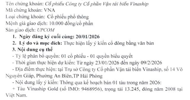 HĐQT Vinaship lên kế hoạch xin ý kiến cổ đông về bán bớt một tàu đang sở hữu. Thời gian lấy ý kiến dự kiến từ ngày 23/1 đến ngày 9/2.