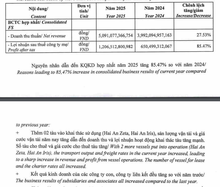 Theo HAH, nguyên nhân chính khiến kết quả kinh doanh hợp nhất năm 2025 tăng hơn 85% do doanh nghiệp có thêm 2 tàu vào khai thác (Hai An Zeta và Hai An Iris), sản lượng vận tải và giá cước tăng dẫn đến doanh thu, lợi nhuận tăng mạnh.