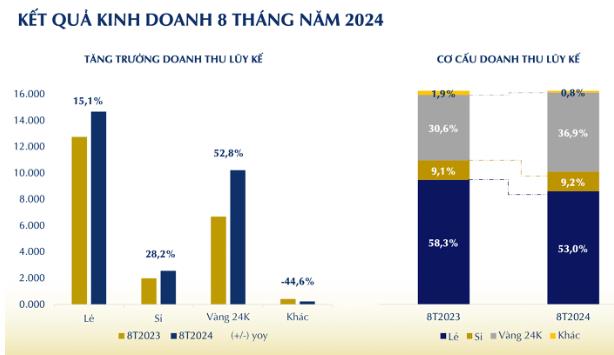 Trong cơ cấu doanh thu 8 tháng đầu năm, nguồn thu từ hoạt động bán lẻ chiếm 53% tăng trưởng 15,1% so với cùng kỳ. Kết quả này có được là vào việc mở rộng mạng lưới phân phối tiếp cận gần hơn với khách hàng, đáp ứng nhu cầu mua sắm đa dạng; ra mắt các bộ sưu tập trang sức mới; nâng cao chất lượng dịch vụ...