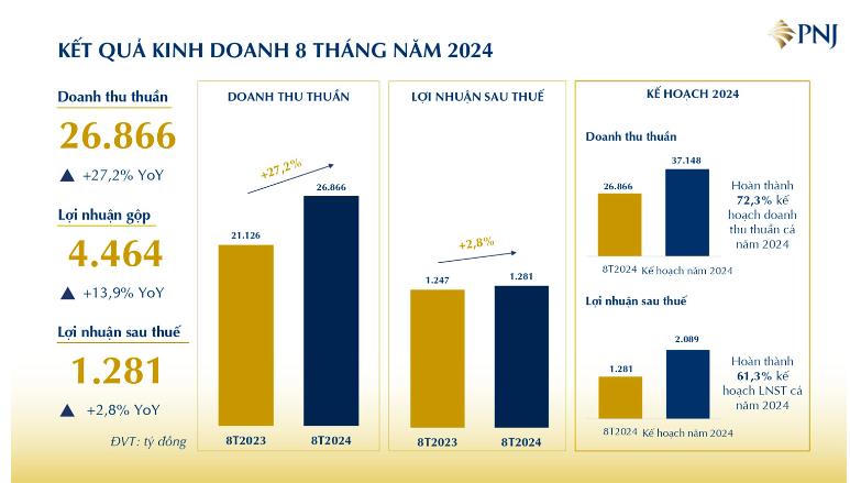 Tính riêng tháng 8, doanh thu PNJ ước đạt 2.245 tỷ đồng doanh thu và lãi sau thuế khoảng 63 tỷ đồng.