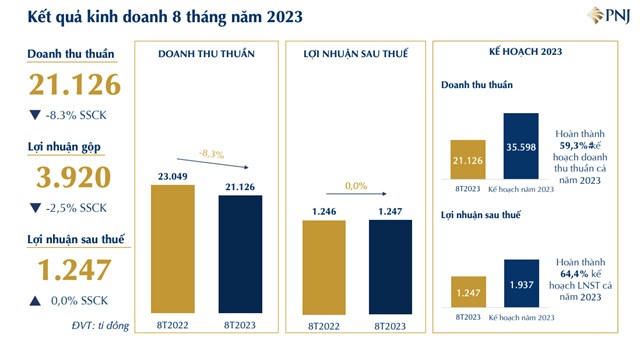 Về bức tranh tài chính, tháng 8/2023, PNJ ghi nhận doanh thu thuần đạt 2.303 tỷ đồng và lợi nhuận sau thuế là 76 tỷ đồng, giảm lần lượt 1,1% và 3,7% so với cùng kỳ năm ngoái.