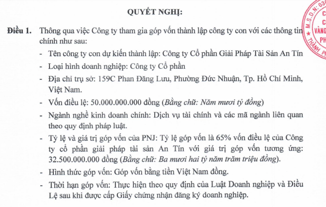Doanh nghiệp mới có vốn điều lệ 50 tỷ đồng, trong đó PNJ góp vốn 32,5 tỷ đồng, tương đương tỷ lệ sở hữu 65% vốn điều lệ. Thời hạn góp vốn được thực hiện theo quy định của Luật Doanh nghiệp và Điều lệ sau khi được cấp Giấy chứng nhận đăng ký doanh nghiệp.