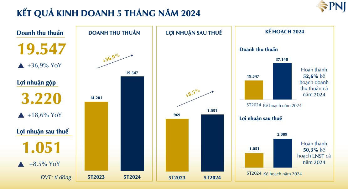 Vàng bạc Đá quý Phú Nhuận (PNJ) lãi hơn 1.000 tỷ đồng sau 5 tháng, doanh thu từ vàng 24K tăng gần gấp đôi