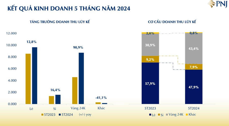 Trong cơ cấu doanh thu 5 tháng của PNJ, doanh thu từ vàng 24K đã tăng gần 91% lên khoảng 8.483 tỷ đồng nhờ sự sôi động của thị trường vàng trong nước.