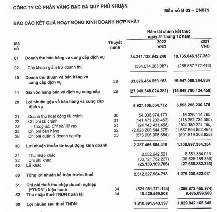 Theo báo cáo tài chính hợp nhất quý IV/2022 đã được kiểm toán, doanh thu lũy kế cả năm 2022 của Công ty cổ phần Vàng bạc Đá quý Phú Nhuận (PNJ) đạt hơn 33.876 tỷ đồng; lợi nhuận sau thuế đạt 1.810 tỷ đồng, tăng lần lượt 73% và 76% so với năm 2021.