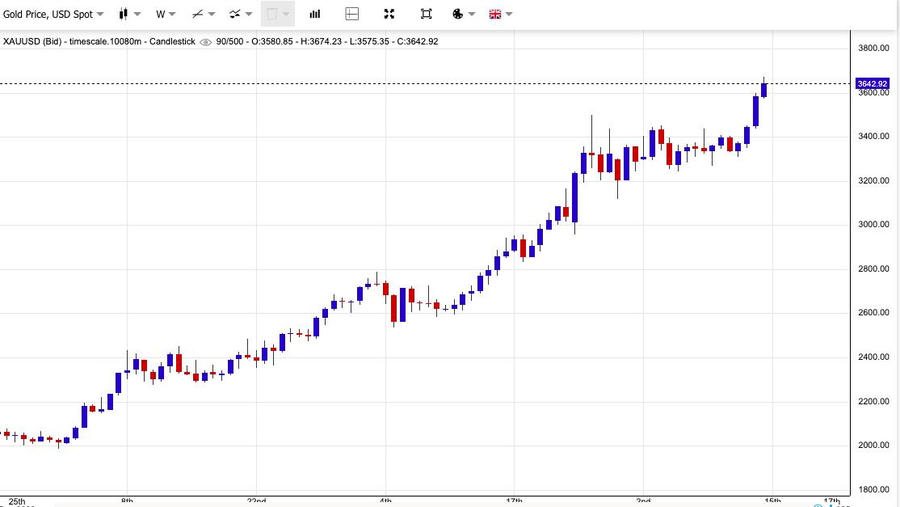 Theo Kitco News, thị trường vàng kết thúc tuần ở mức cao kỷ lục mới, khi dữ liệu kinh tế đáng thất vọng đã "bật đèn xanh" cho Cục Dự trữ Liên bang Mỹ (Fed) tiếp tục chu kỳ nới lỏng lãi suất. Vấn đề mà các nhà đầu tư đang cố gắng tìm hiểu hiện nay là thị trường vàng đã được định giá ở mức nào, khi kim loại quý này đóng cửa tuần ở mức trên 3.600 USD/ounce.
