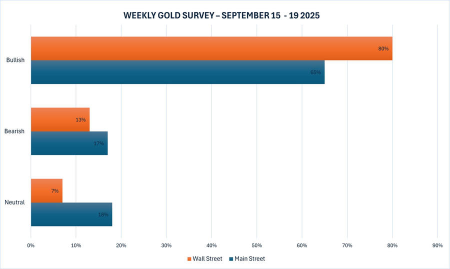 Khảo sát vàng hàng tuần mới nhất của Kitco News cho thấy tâm lý của Phố Wall vẫn rất lạc quan trước khi Fed dự kiến cắt giảm lãi suất, trong khi các nhà đầu tư Main Street kiềm chế tâm lý lạc quan của mình sau mức tăng gần đây của giá vàng.