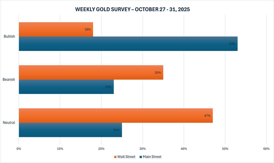 Khảo sát vàng hàng tuần mới nhất của một nền tảng thông tin tài chính quốc tế cho thấy phần lớn giới phân tích Phố Wall chuyển sang quan điểm bi quan hoặc trung lập, trong khi nhà đầu tư nhỏ lẻ vẫn giữ quan điểm lạc quan nhẹ với vàng.