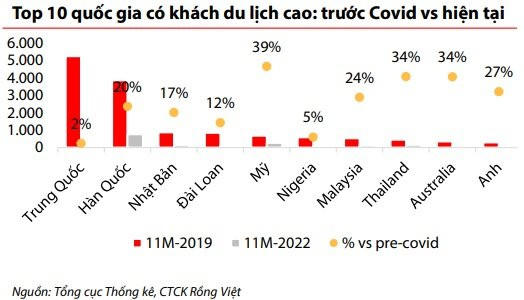 Tương tự, trong lĩnh vực du lịch, lượt khách du lịch đến Việt Nam vẫn ở mức thấp do thiếu vắng một lượng lớn khách Trung Quốc, VDSC kỳ vọng việc mở cửa trở lại trên sẽ mang đến nhiều du khách và nguồn thu cho du lịch năm 2023.