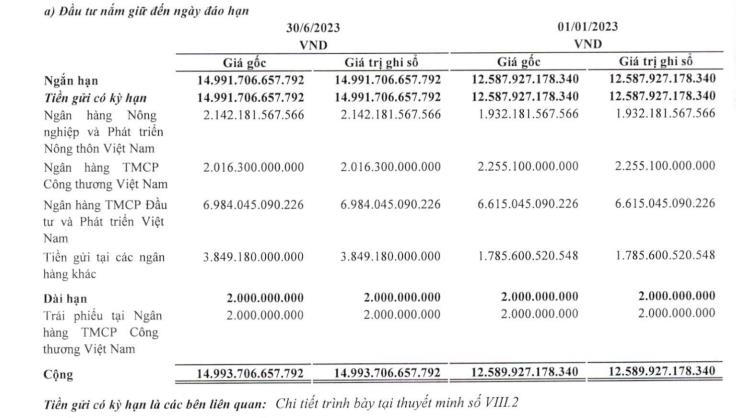 Chiếm phần lớn là tiền gửi ngân hàng với 14.991 tỷ đồng, tăng hơn 2.400 tỷ đồng so với hồi đầu năm. Trong đó, có tới 6.984 tỷ đồng tiền gửi Ngân hàng TMCP Đầu tư và phát triển Việt Nam; 2.142 tỷ đồng gửi Ngân hàng Nông nghiệp và Phát triển Nông thôn Việt Nam và 2.016 tỷ đồng gửi Ngân hàng TMCO Công thương Việt Nam.