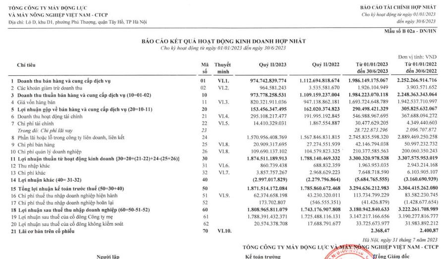 Báo cáo tài chính hợp nhất quý II/2023 của Tổng công ty Máy động lực và máy nông nghiệp Việt Nam (VEAM - mã ck: VEA) ghi nhận doanh thu thuần đạt 973,7 tỷ đồng, giảm 12% so với cùng kỳ.