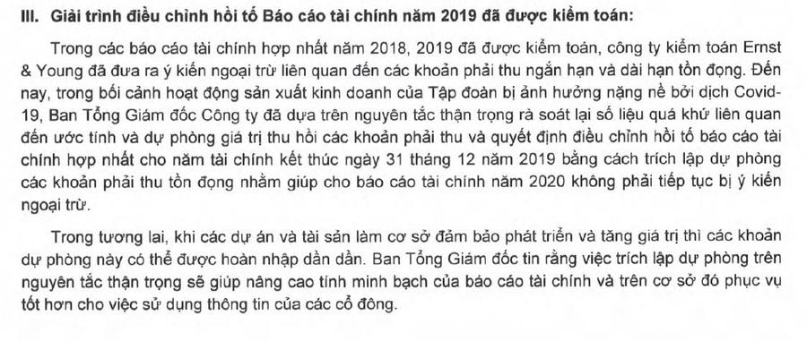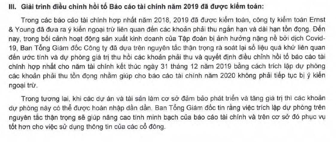 Tại báo cáo tài chính kiểm toán năm 2019, Ernst & Young Vietnam đã đưa ra ý kiến ngoại trừ do không thể thu thập đầy đủ bằng chứng thích hợp để xác định khả năng thu hồi dư nợ 5.669 tỷ đồng (tại ngày 31/12/2019) trên tổng giá trị phải thu ngắn - dài hạn 10.505 tỷ đồng.