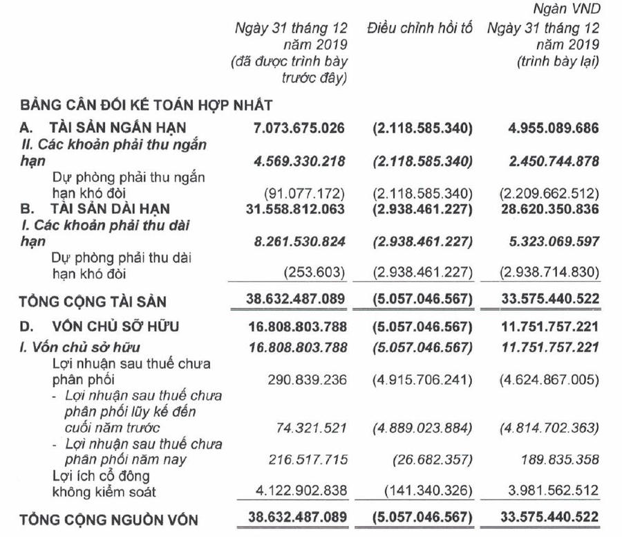 Các khoản mục trên bảng cân đối kế toán của Hoàng Anh Gia Lai tại thời điểm 31/12/2019 đã được trình bày lại tại báo cáo quý 4/2020. Trong đó, số lợi nhuận/lỗ lũy kế chưa phân phối từ 291 tỷ đồng đã giảm xuống âm 4.625 tỷ đồng sau điều chỉnh. Lỗ lũy kế tại thời điểm 31/12/2020 được HAG ghi nhận âm 5.086 tỷ đồng.