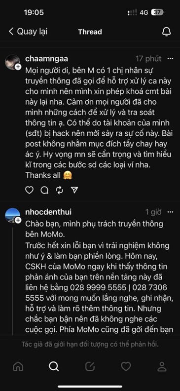 "Vào khoảng 19h tối ngày 29/3, sau nhiều lần liên hệ, đại diện MoMo đã có cơ hội trao đổi với khách hàng qua điện thoại. Đại diện của MoMo đã xin lỗi khách hàng vì trải nghiệm không tốt, đồng thời lắng nghe, giải thích, tư vấn về dịch vụ, khuyến cáo an toàn bảo mật và làm rõ những thắc mắc của khách hàng.