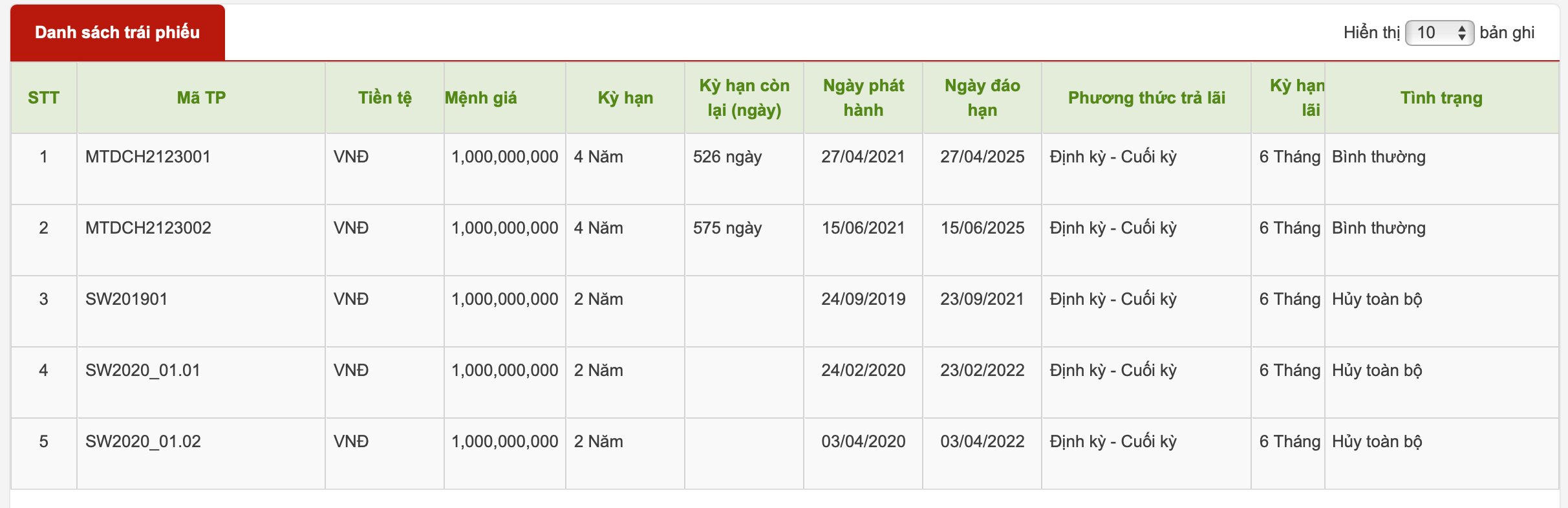 Cũng theo HNX, Công ty Đường Mặt trời đang lưu hành hai lô trái phiếu phát hành từ năm 2021 đó là MTDCH2123001 giá trị phát hành 250 tỷ đồng và mã MTDCH2123002 giá trị phát hành 200 tỷ đồng. Đơn vị lưu ký là Chứng khoán SSI.