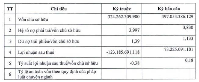 Vốn chủ sở hữu ghi nhận tại 397 tỷ đồng, tăng 22% so với kỳ trước. Tỷ suất lợi nhuận sau thuế/vốn chủ sở hữu được cải thiện từ âm 0,38 lần thành 0,18 lần.