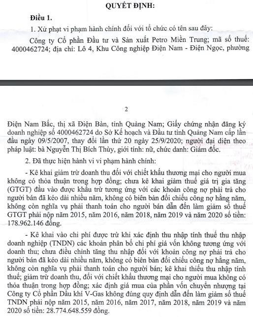 Cụ thể, theo quyết định này, Petro Miền Trung đã vi phạm khi kê khai giảm trừ doanh thu đối với chiết khấu thương mại cho người mua không có thỏa thuận trong hợp đồng; chưa kê khai giảm thuế giá trị gia tăng đầu vào được khấu trừ tương ứng với các khoản công nợ phải trả cho người bán đã kéo dài nhiều năm, không có biên bản đối chiếu công nợ hằng năm, không còn nghĩa vụ phải thanh toán cho người bán dẫn đến làm giảm số thuế giá trị gia tăng phải nộp năm 2015, năm 2016, năm 2018, năm 2019 và năm 2020 số tiền là 178,96 triệu đồng.