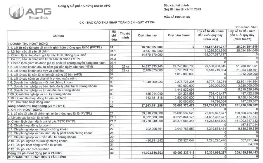 Lũy kế 9 tháng đầu năm, Chứng khoán APG ghi nhận doanh thu đạt 224,2 tỷ đồng, tăng 23% so với cùng kỳ. Lợi nhuận sau thuế ghi nhận khoản lãi 101 tỷ đồng, trong khi cùng kỳ lỗ 48,3 tỷ đồng.