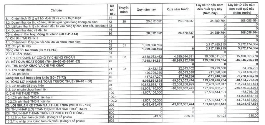 Trong đó, doanh thu mảng môi giới ghi nhận sự sụt giảm mạnh về mức 1,34 tỷ đồng, trong khi cùng kỳ là 2,27 tỷ đồng. Doanh thu từ nghiệp vụ tư vấn đầu tư chứng khoán và bảo lãnh, đại lý phát hành chứng khoán không quý III/2023 không có, trong khi cùng kỳ đạt 1,4 tỷ đồng và 150 triệu.