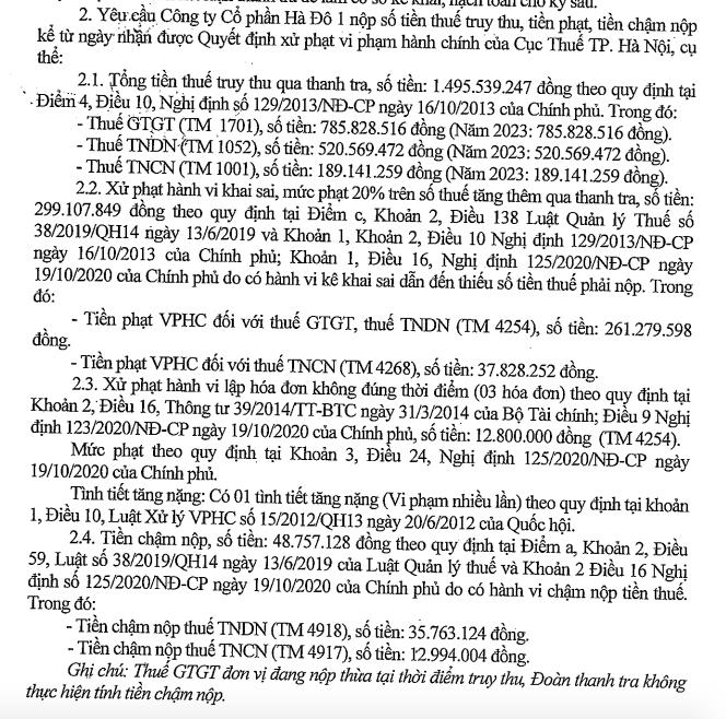 Bên cạnh đó, Hà Đô 1 cũng bị xử phạt do có hành vi lập hoá đơn không đúng thời điểm (3 hoá đơn) theo quy định của Bộ Tài chính với số tiền 12,8 triệu đồng. Số tiền chậm nộp của Hà Đô 1 là 48,7 triệu đồng.