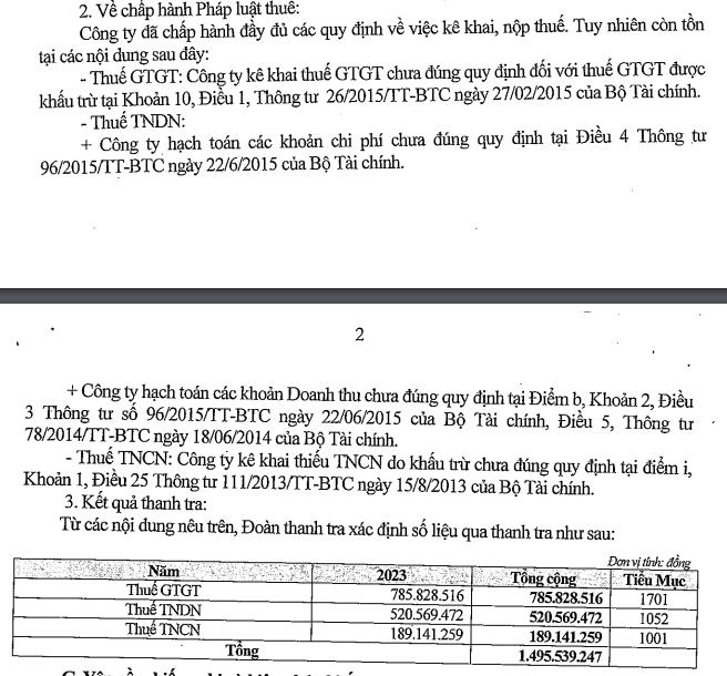 Trong đó, tổng số tiền thuế truy thu qua thanh tra số tiền 1,49 tỷ đồng bao gồm thuế giá trị gia tăng hơn 785,8 triệu đồng; thuế thu nhập doanh nghiệp hơn 520,5 triệu đồng và thuế thu nhập cá nhân hơn 189,1 triệu đồng.