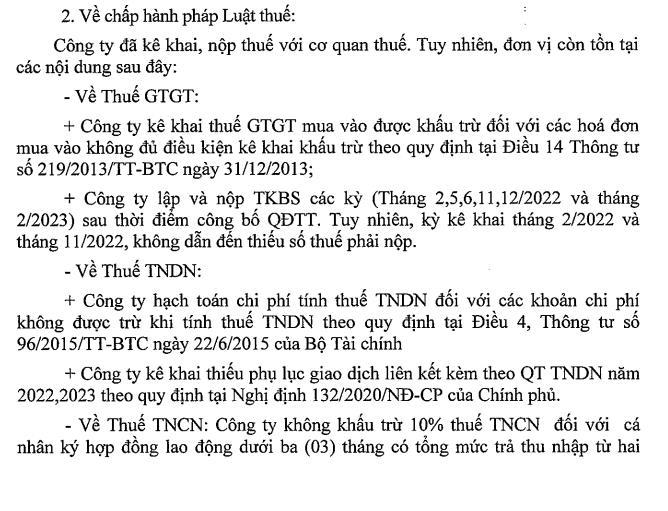 Về thuế TNDN, công ty hạch toán chi phí tính thuế TNDN với các khoản chi phí không được trừ khi tính thuế TNDN; công ty kê khai thiếu phụ lục giao dịch liên kết kèm theo quyết toán TNDN năm 2022, 2023 theo quy định. Công ty kê khai thiếu phục lục giao dịch liên kết kèm theo quyết toán TNDN năm 2022, 2023.