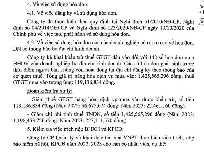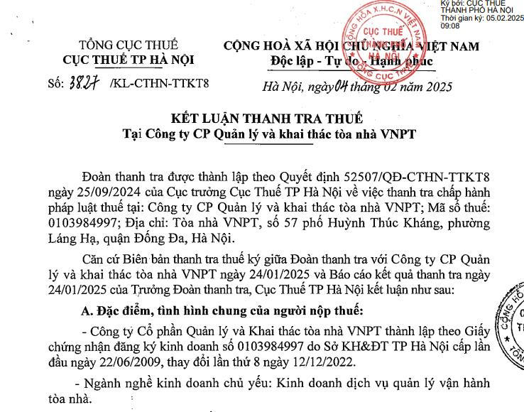 Ngày 4/2/2025, Cục thuế TP Hà Nội (Tổng cục Thuế) đã công bố kết luận thanh tra thuế tại Công ty cổ phần Quản lý và khai thác tòa nhà VNPT, có địa chỉ tại toà nhà VNPT, số 57 Huỳnh Thúc Kháng, phường Láng Hạ, quận Đống Đa, Hà Nội.