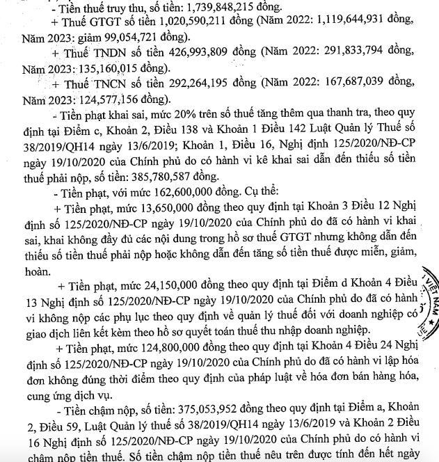 Cục Thuế Hà Nội cũng yêu cầu công ty nộp số tiền thuế truy thu, tiền phạt, tiền chậm nộp kể từ ngày nhận quyết định xử phạt vi phạm pháp luật về thuế tổng số tiền là 2,66 tỷ đồng. Trong đó, tiền truy thu là 1,73 tỷ đồng; tiền phạt khai sai mức 20% số thuế tăng thêm qua thanh tra do có hành vi kê khai sai dẫn đến thiếu số tiền thuế phải nộp là 385,7 triệu đồng.