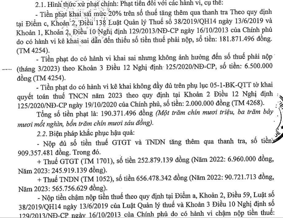 Về biện pháp khắc phục hậu quả, Cục thuế Hà Nội yêu cầu doanh nghiệp phải nộp đủ số thuế giá trị gia tăng và thu nhập doanh nghiệp tăng thêm qua thanh tra với tổng số tiền là 909,3 triệu đồng. Bên cạnh đó, Doanh nghiệp phải nộp tiền chậm nộp thuế so với thời hạn quy định số tiền 77,6 triệu đồng. Số tiền chậm nộp tiền thuế nêu trên được tính hết ngày 10/11/2024.