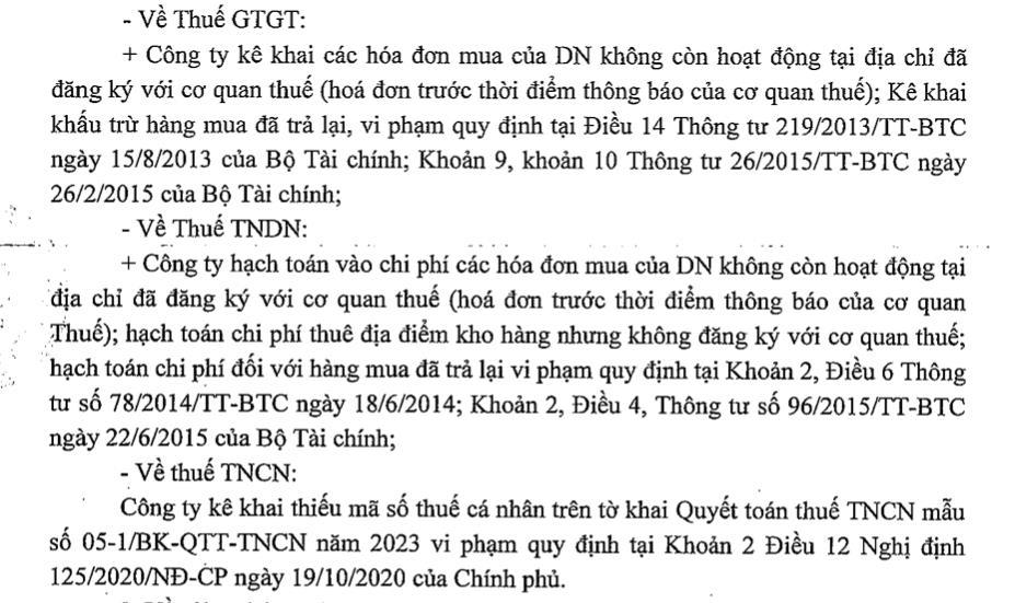 Cụ thể, về thuế giá trị gia tăng, công ty kê khai các hóa đơn mua của doanh nghiệp không còn hoạt động tại địa chỉ đã đăng ký với cơ quan thuế (hóa đơn trước thời điểm thông báo của cơ quan thuế); kê khai khấu trừ hàng mua đã trả lại, vi phạm quy định điều 14 Thông tư 219/2013/TT-BTC ngày 15/8/2023 của Bộ Tài chínhl khoản 9, 10 Thông tư 26/2015/TT-BTC ngày 26/2/2015 của Bộ Tài chính.
