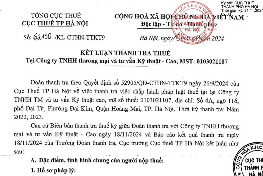Theo kết luận Thanh tra thuế số 62130/KL-CTHN-TTKT9 của Cục Thuế TP Hà Nội đối với Công ty TNHH thương mại và tư vấn Kỹ thuật - Cao, cơ quan thanh tra đã chỉ ra nhiều vi phạm về thuế của doanh nghiệp này.
