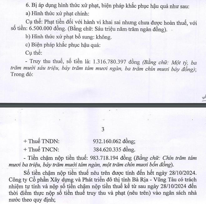 Vi phạm thuế, Công ty Xây dựng và Phát triển Đô thị Tỉnh Bà Rịa Vũng Tàu (UDC) bị xử phạt hơn 2,3 tỷ đồng