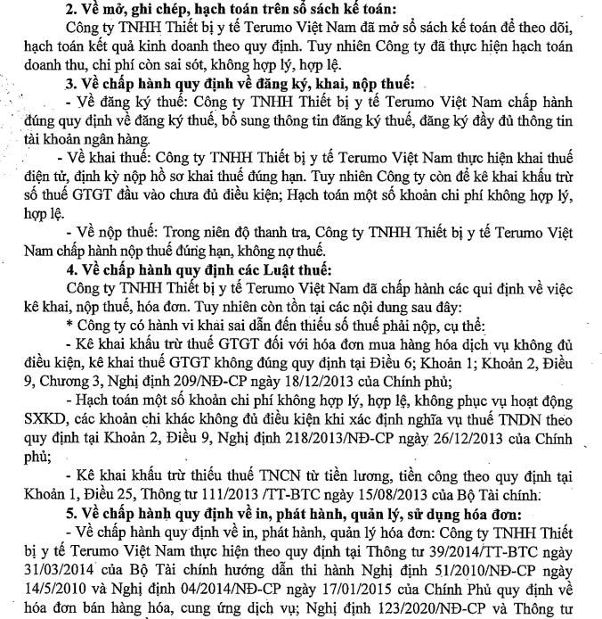 Về chấp hành quy định các luật thuế, Công ty Thiết bị y tế Terumo Việt Nam có hành vi khai sai dẫn đến thiếu số thuế phải nộp, cụ thể, công ty kê khai khấu trừ thuế GTGT đối với hóa đơn mua hàng hóa dịch vụ không đủ điều kiện, kê khai thuế GTGT không đúng quy định. Ngoài ra, công ty còn hạch toán một số khoản chi phí không hợp lý, hợp lệ, không phục vụ hoạt động sản xuất kinh doanh, các khoản chi phí khác không đủ điều kiện khi xác định nghĩa vụ thuế TNDN theo đúng quy định; kê khai khấu trừ thiếu thuế TNCN từ tiền lương, tiền công.