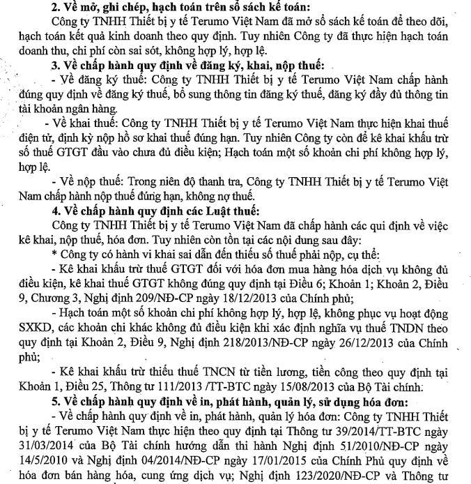 Theo kết luận Thanh tra, Cục thuế TP Hà Nội đã chỉ ra nhiều sai phạm còn tồn tại của Công ty TNHH Thiết bị y tế Terumo Việt Nam.