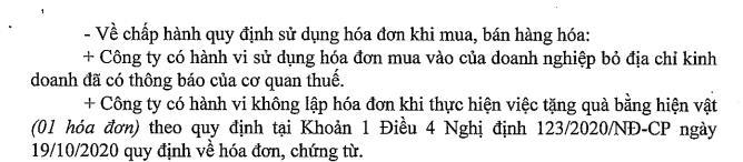 Về chấp hành quy định về in, phát hành, quản lý, sử dụng hoá đơn, Công ty TNHH Thiết bị y tế Terumo Việt Nam có hành vi sử dụng hoá đơn mua vào của doanh nghiệp bỏ địa chỉ kinh doanh đã có thông báo của cơ quan thuế. Ngoài ra, Công ty còn có hành vi không lập hoá đơn khi thực hiện việc tặng quà bằng hiện vật (01 hoá đơn).