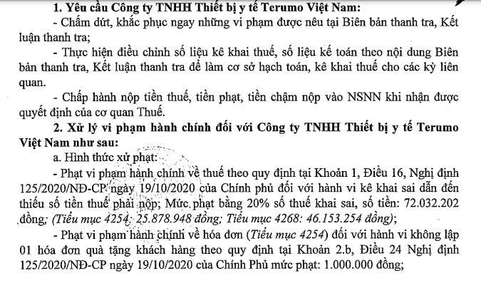 Với những sai phạm còn tồn tại trên, Cục thuế TP Hà Nội yêu cầu Công ty TNHH Thiết bị y tế Terumo Việt Nam chấm dứt, khắc phục ngay những vi phạm được nêu tại Kết luận thanh tra, thực hiện điều chỉnh số liệu kê khai thuế, số liệu kế toán để làm cơ sở hạch toán, kê khai thuế cho các kỳ liên quan. Đồng thời, công ty chấp hành nộp tiền thuế, tiền phạt, tiền chậm nộp vào Ngân sách Nhà nước khi nhận được quyết định của cơ quan thuế.