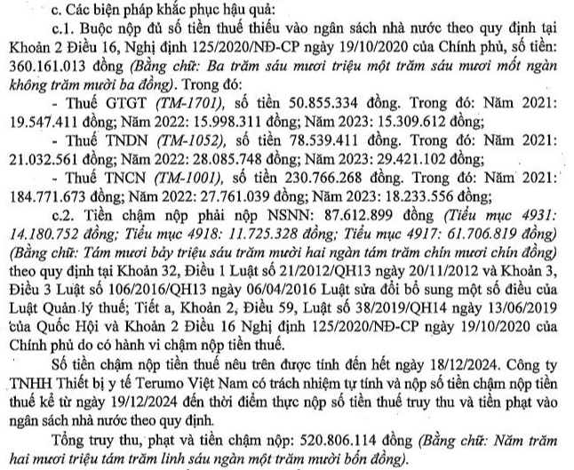 Như vậy, tổng số tiền truy thu, phạt và tiền chậm nộp mà Công ty Thiết bị y tế Terumo Việt Nam phải nộp là hơn 520,8 triệu đồng.