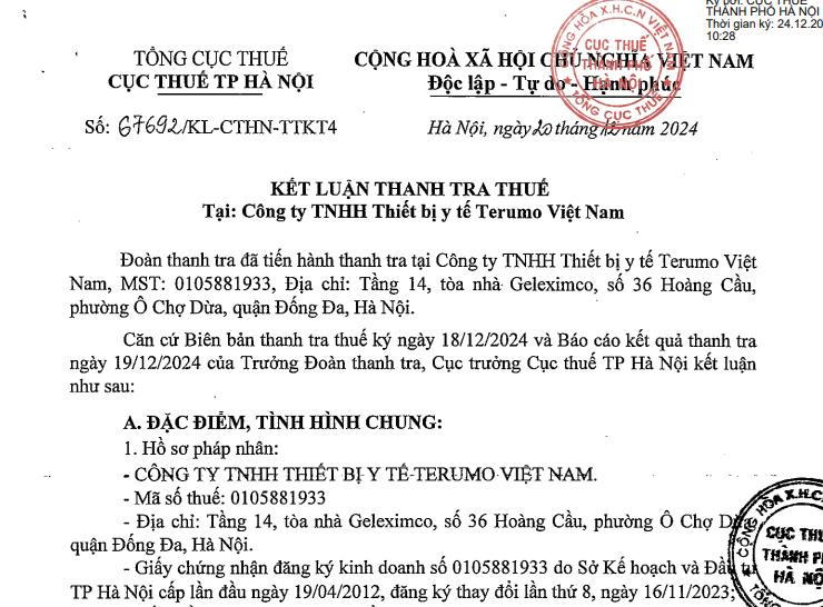 Ngày 20/12/2024, Cục Thuế TP Hà Nội công bố kết luận thanh tra thuế tại Công ty TNHH Thiết bị y tế Terumo Việt Nam. Công ty có địa chỉ tại tầng 14, toà nhà Geleximco, số 36 Hoàng Cầu, phường Ô chợ Dừa, quận Đống Đa, Hà Nội.