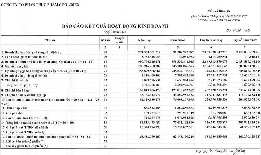 Về tình hình kinh doanh, theo báo cáo tài chính quý III/2024 Cholimex Food ghi nhận doanh thu thuần đạt 990,7 tỷ đồng, tăng 11,1% so với cùng kỳ năm trước; doanh thu hoạt động tài chính 1,15 tỷ đồng, giảm 84,15%.