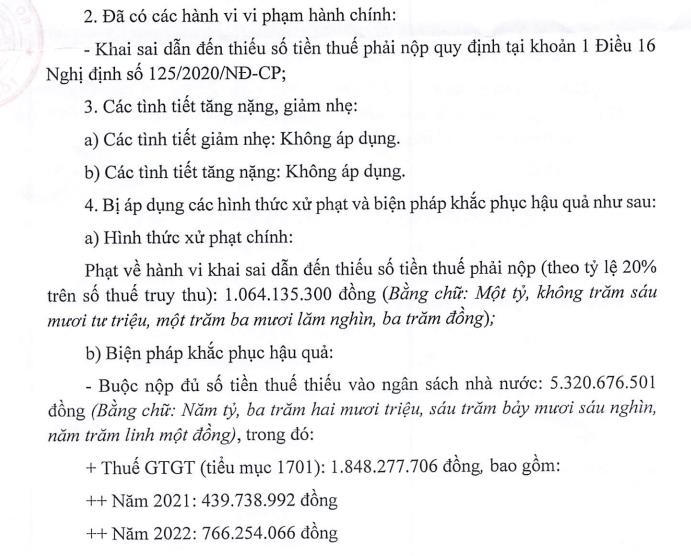 Đồng thời, Cholimex Food buộc phải nộp đủ số tiền thuế thiếu vào ngân sách nhà nước hơn 5,3 tỷ đồng. Trong đó, phần thiếu thuế giá trị gia tăng là hơn 1,8 tỷ đồng, phần thiếu thuế thu nhập doanh nghiệp là gần 3,2 tỷ đồng, thiếu thuế thu nhập cá nhân với số tiền 304 triệu đồng.