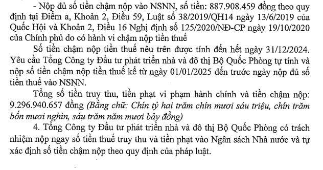 Cùng với đó, Tổng Công ty Đầu tư phát triển nhà và đô thị Bộ Quốc Phòng còn phải nộp đủ số tiền chậm nộp vào ngân sách nhà nước số tiền 887,9 triệu đồng do có hành vi chậm nộp tiền thuế. Số tiền chậm nộp tiền thuế nêu trên tính hết ngày 31/12/2024. Tổng Công ty Đầu tư phát triển nhà và đô thị Bộ Quốc Phòng sẽ có nhiệm vụ tự tính và nộp số tiền chậm nộp thuế kể từ ngày 1/1/2025 đến trước ngày nộp đủ số tiền thuế vào Ngân sách nhà nước.