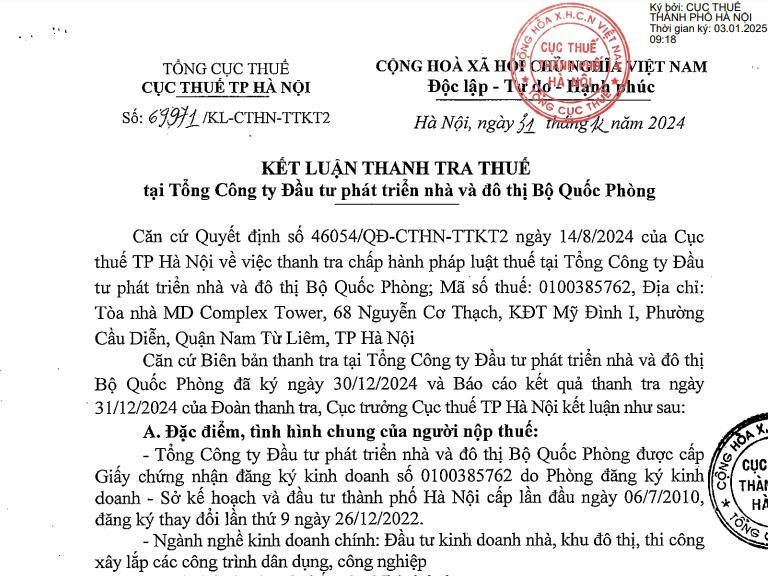 Ngày 31/12/2024, Cục thuế TP Hà Nội (Tổng cục Thuế) đã ban hành kết luận thanh tra thuế tại Tổng Công ty Đầu tư phát triển nhà và đô thị Bộ Quốc Phòng. Công ty có địa chỉ tại toà nhà MD Complex Tower, 68 Nguyễn Cơ Thạch, KĐT Mỹ Đình I, phường Cầu Diễn, quận Nam Từ Liêm, Hà Nội.